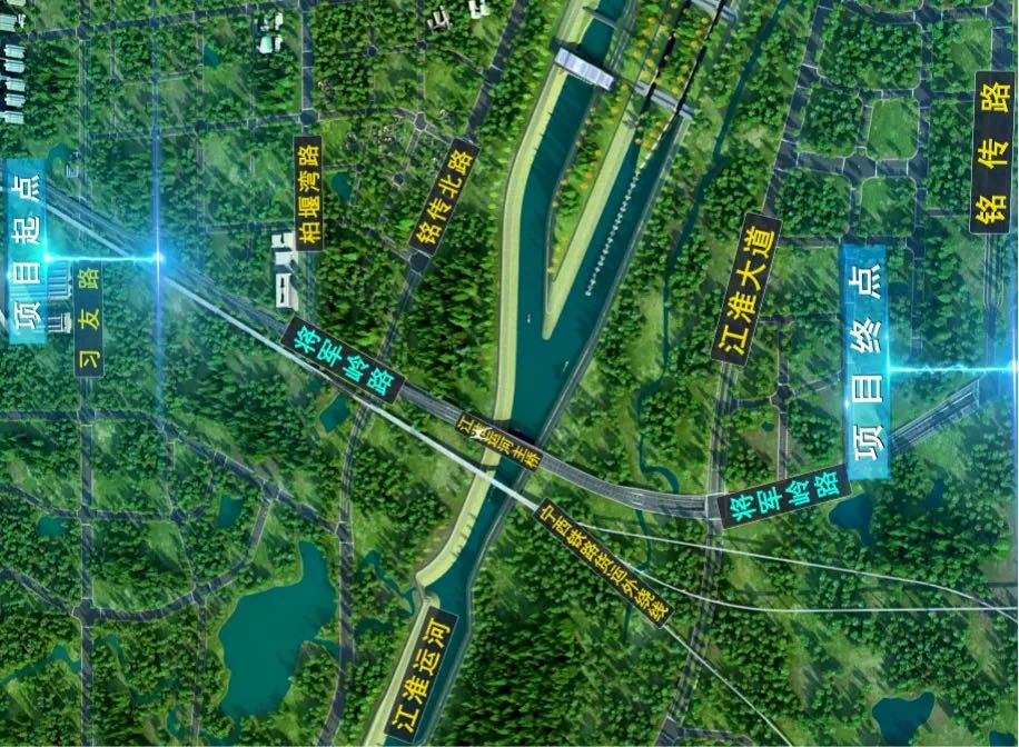 将军岭路(习友路-铭传路)工程项目起于习友路跨线桥落地点,向南连续上跨柏堰湾路、铭传北路,顺接现状江淮运河主桥(江淮运河两岸新建引桥),主线下穿江淮大道及铭传路。全长约3.8公里,为城市主干路,主线双向六车道,设计速度60公里每小时。
