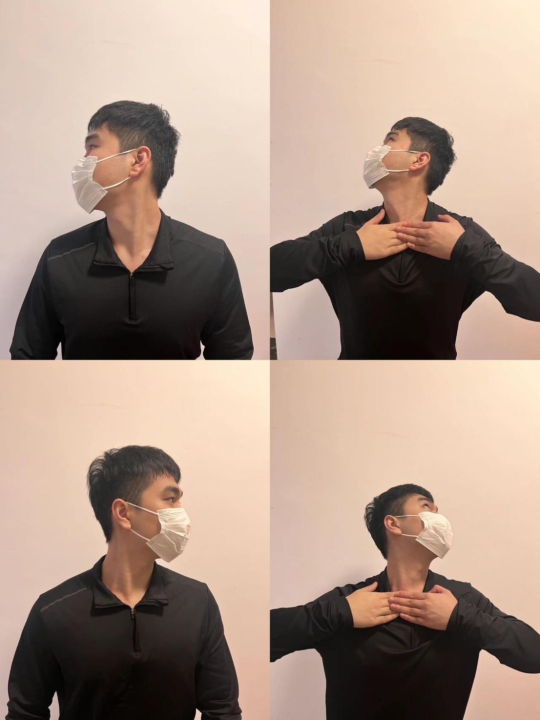 1.找到自己的胸锁乳突肌位置,把头偏向一边,会有一个“大筋”