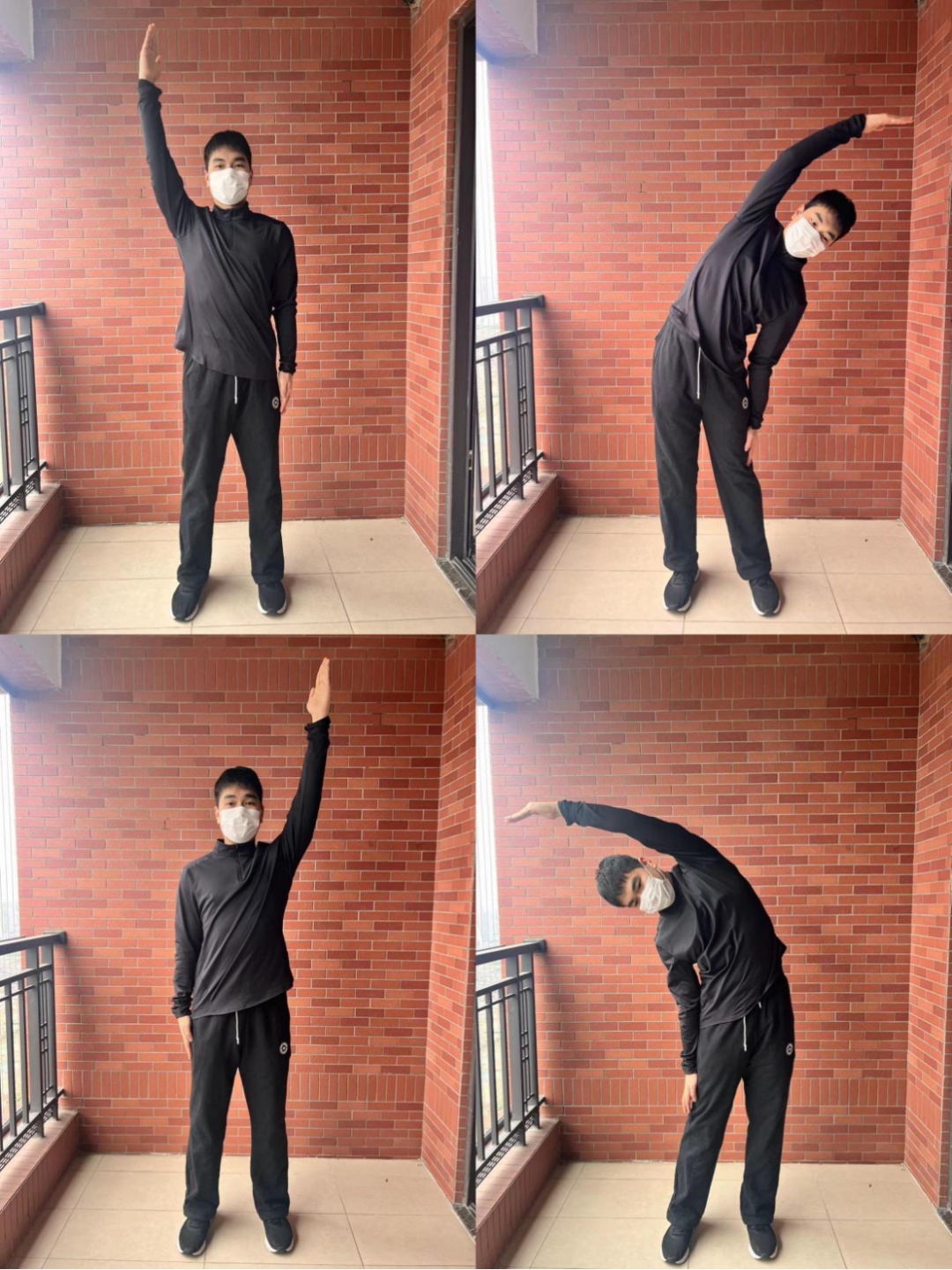 动作要领:拉伸躯干侧面肌肉,弯曲至最大幅度,保持25秒;每组6-10次,重复2-4组。