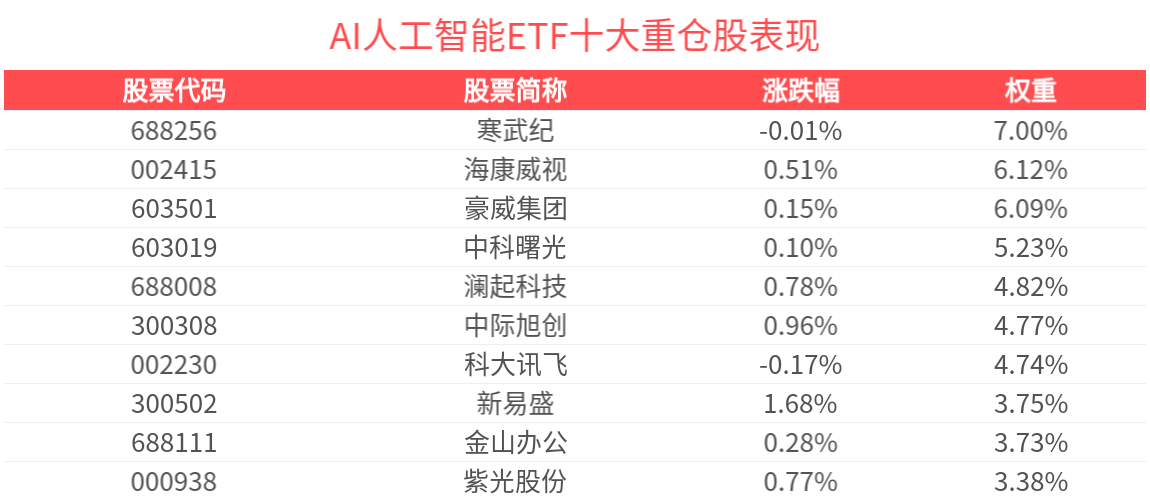数据显示,截至2025年6月30日,中证人工智能主题指数(930713)前十大权重股分别为中际旭创(300308)、新易盛(300502)、寒武纪(688256)、科大讯飞(002230)、豪威集团(603501)、中科曙光(603019)、海康威视(002415)、澜起科技(688008)、金山办公(688111)、浪潮信息(000977),前十大权重股合计占比52.8%。