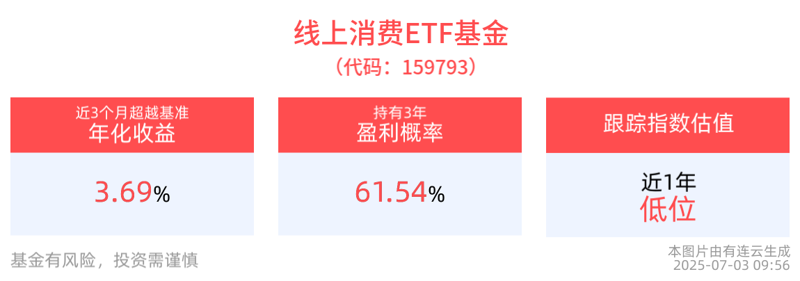 截至2025年7月3日 09:56,中证沪港深线上消费主题指数(931481)下跌1.06%。成分股方面涨跌互现,中国电影(600977)领涨2.62%,盐津铺子(002847)上涨1.53%,万润科技(002654)上涨1.40%;金山软件(03888)。线上消费ETF基金(159793)最新报价0.91元。拉长时间看,截至2025年7月2日,线上消费ETF基金近1月累计上涨4.91%。截至7月2日,线上消费ETF基金近1年净值上涨45.45%。