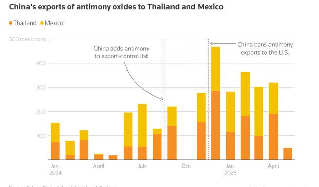 中国海关数据显示,截至今年5月,泰国与墨西哥已跃升为中国锑出口的前三大目的地,而在禁令前的2023年,这两国甚至未进入前十。
