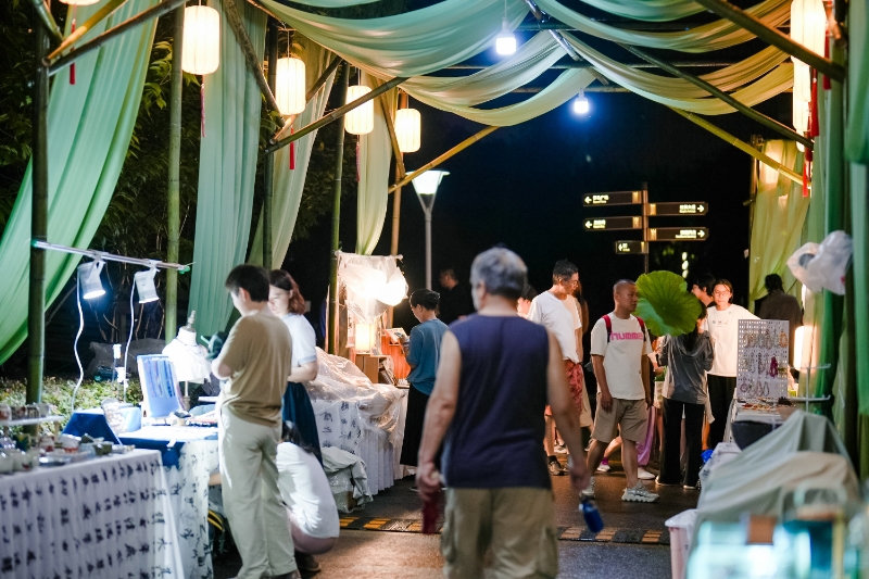 踏入公园北门,品牌快闪区人潮涌动,十余家知名品牌与四大商场商户或携车带货,或搭景办展,各显神通。沿着长堤石桥信步而行,仿佛步入一幅流动的画卷。一侧,碧波之上,翠盖红裳的荷花亭亭玉立;另一侧,蜿蜒的文创美食市集灯火通明,人声鼎沸。“文艺范”的手作、“小清新”的饰品、“精致风”的茶点琳琅满目,诱人的食物香气与摊主热情的吆喝交织,鲜活的市井烟火气在荷风里氤氲升腾,游人穿梭其间,或驻足挑选心仪好物,或举着特色小吃大快朵颐。