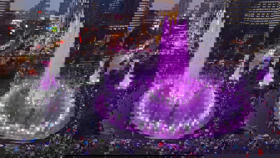 晚上7时许,音乐喷泉广场水幕乍起。伴随着激昂或舒缓的乐章,一场水火交融的视听奇观震撼上演。水珠带着清凉扑面而来,瞬间驱散暑意;紧接着,表演者踏着喷涌的水流腾空跃起,手持烈焰在湖面之上闪转腾挪、翩然起舞。水火相激,光影交错,水雾弥漫中上演“水上火壶”奇景,引得观众惊呼连连,掌声雷动。