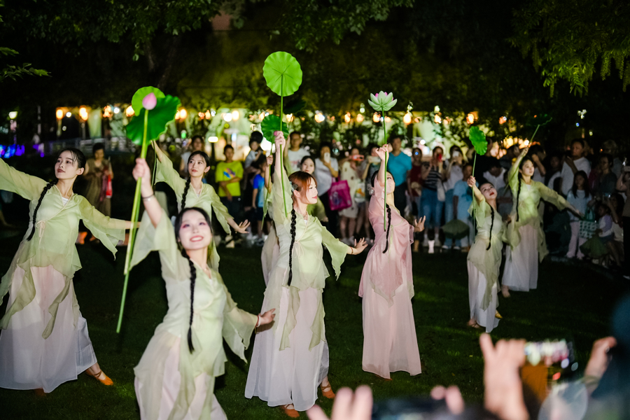 不经意间,一支衣袂飘飘的国风快闪队伍已巡游至眼前,沿着“音乐喷泉-荷花池”的路线翩跹而行,精致的妆容、曼妙的舞姿,与荷塘夜色、市集灯火交相辉映,成为游园会上一道流动的靓丽风景。市民王阿姨家住附近绿色丽园,这是她第三次来大宁公园逛荷花节,“今年活动内容比往年丰富不少,古色古香、氛围感十足,小朋友特别喜欢”。