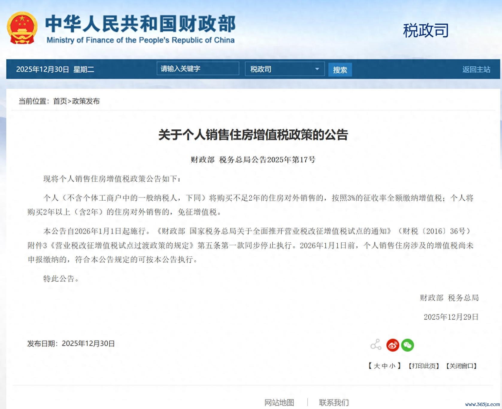 2025年12月30日,财政部、税务总局发布公告:个人将购买不足2年的住房对外销售的,按照3%的征收率全额缴纳增值税;个人将购买2年以上(含2年)的住房对外销售的利赢汇,免征增值税。